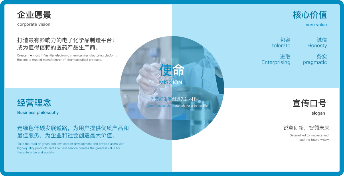 打造最有影響力的電子化學品制造平臺;成為值得信賴的醫(yī)藥產品生產商